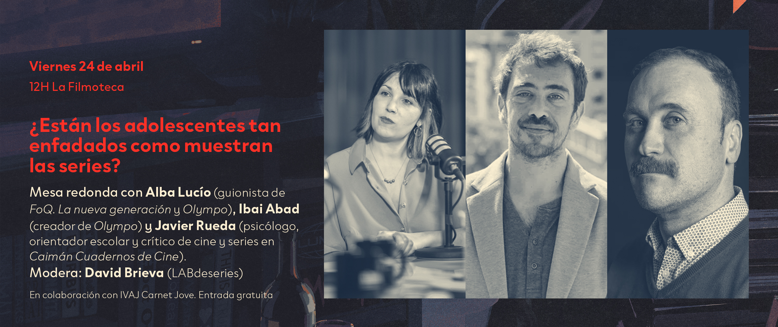 ¿𝐄𝐬𝐭𝐚́𝐧 𝐥𝐨𝐬 𝐚𝐝𝐨𝐥𝐞𝐬𝐜𝐞𝐧𝐭𝐞𝐬 𝐭𝐚𝐧 𝐞𝐧𝐟𝐚𝐝𝐚𝐝𝐨𝐬 𝐜𝐨𝐦𝐨 𝐦𝐮𝐞𝐬𝐭𝐫𝐚𝐧 𝐥𝐚𝐬 𝐬𝐞𝐫𝐢𝐞𝐬? En el LABdeseries intentaremos dar respuesta a este enigma con los expertos 𝐀𝐥𝐛𝐚 𝐋𝐮𝐜𝐢́a ((guionista de FoQ, La nueva generación y Olympo), 𝐈𝐛𝐚𝐢 𝐀𝐛𝐚𝐝 (creador de Olympo) y 𝐉𝐚𝐯𝐢𝐞𝐫 𝐑𝐮𝐞𝐝𝐚 (psicólogo,...